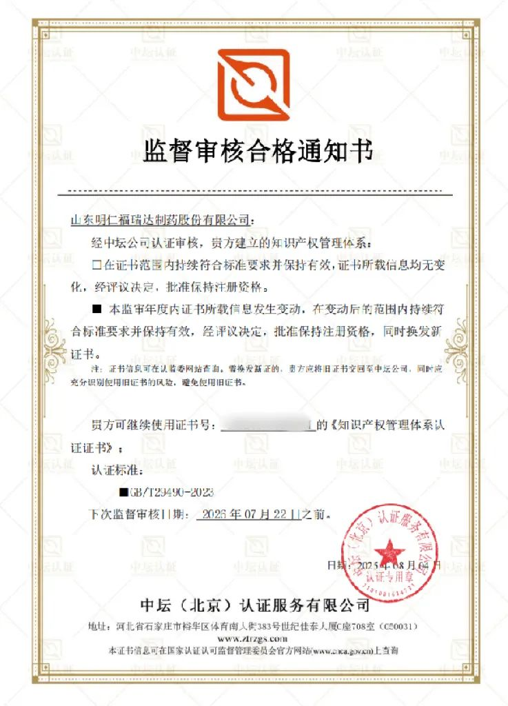 近日,山東明仁福瑞達(dá)制藥股份有限公司經(jīng)嚴(yán)格評(píng)審,順利通過知識(shí)產(chǎn)權(quán)合規(guī)管理體系現(xiàn)場(chǎng)監(jiān)督審核,成功保持認(rèn)證資格并換發(fā)新證書,標(biāo)志著企業(yè)在知識(shí)產(chǎn)權(quán)規(guī)范化管理領(lǐng)域再邁堅(jiān)實(shí)一步。