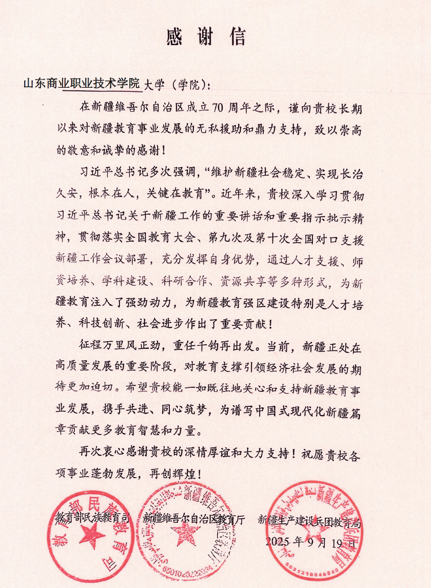 近日,教育部民族教育司、新疆維吾爾自治區(qū)教育廳與新疆生產(chǎn)建設(shè)兵團(tuán)教育局聯(lián)合向山東商職學(xué)院發(fā)來(lái)感謝信,對(duì)山東商職學(xué)院“長(zhǎng)期以來(lái)對(duì)新疆教育事業(yè)發(fā)展的無(wú)私援助和鼎力支持,致以崇高敬意與誠(chéng)摯感謝”!
