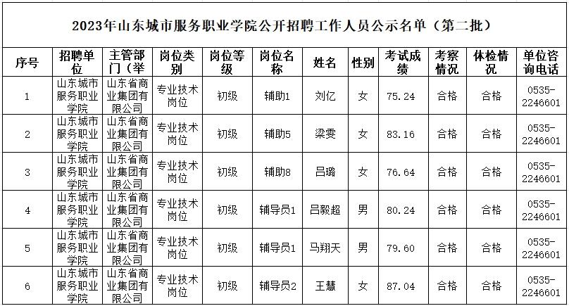 根據(jù)《中共山東省委組織部、山東省人力資源和社會保障廳關(guān)于印發(fā)2023年度省屬事業(yè)單位公開招聘工作實施方案的通知》(魯人社發(fā)〔2022〕23號)等相關(guān)規(guī)定,山東城市服務(wù)職業(yè)學(xué)院經(jīng)過公開招聘報名、考試、考察、體檢等工作,現(xiàn)對擬聘用人員(第二批)進(jìn)行公示,公示期為7個工作日,自2023年11月23日至2023年12月1日(不含節(jié)假日)。公示期間,如對公示人選有異議,請及時向山東省商業(yè)集團有限公司反映。