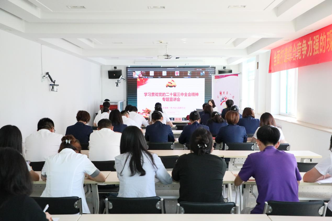 會議要求,學習好貫徹好黨的二十屆三中全會精神是當前和今后時期的一項重大政治任務。要充分認識黨的二十屆三中全會召開的重大意義和總體要求,切實把思想和行動統一到習近平總書記重要講話和黨的二十屆三中全會精神上來,切實推動黨的二十屆三中全會精神在銀座幼教落地。要持續(xù)興起學習宣傳黨的二十屆三中全會精神熱潮,多層次多角度宣傳會議精神,組織和引導基層黨員群眾加強對黨的二十屆三中全會精神的學習,切實將學習成果轉化為工作實效。要聚焦中心工作,正確分析形勢,圍繞主責主業(yè),創(chuàng)建“文化年、質量年、創(chuàng)新年”,持續(xù)提升核心競爭力,加快轉型步伐,推動“幼教+”多元化發(fā)展,牢固樹立建設學前教育領軍品牌的堅定信念,推動事業(yè)高質量發(fā)展。